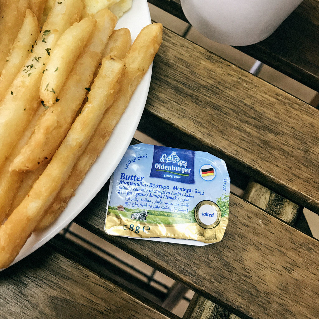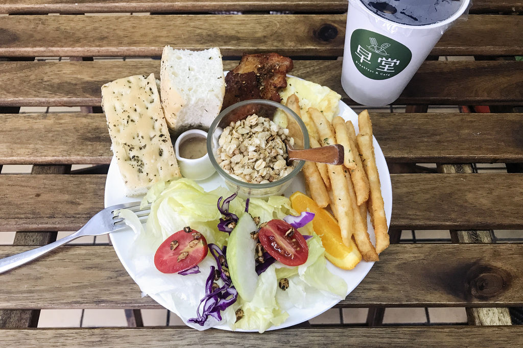 (佛卡夏、炒蛋、香料腿排、優格、鮮蔬、薯條。套餐附小杯紅茶)